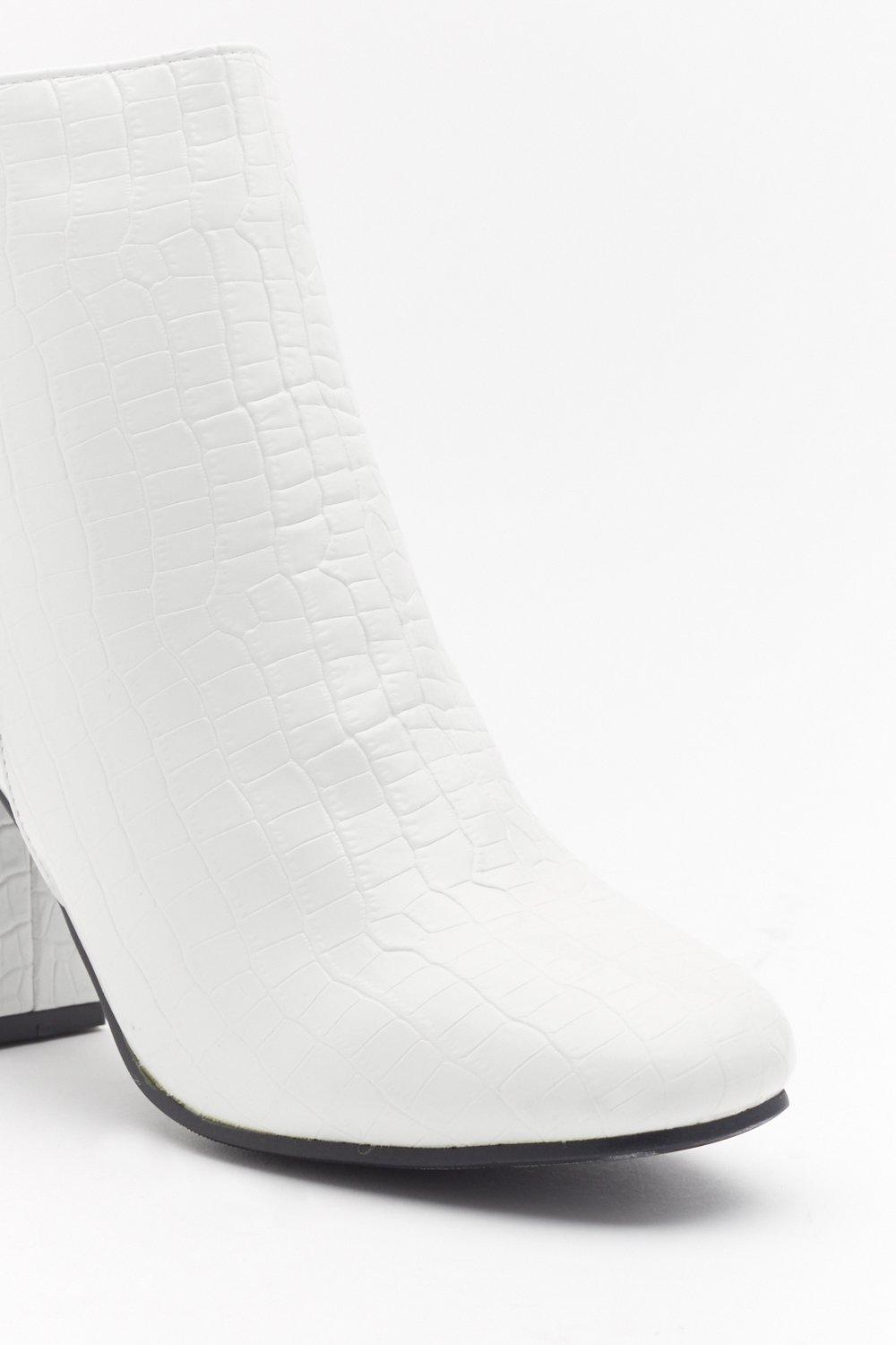 Zapatos estilo botín de tacón grueso en imitación piel de cocodrilo blanco | boohoo