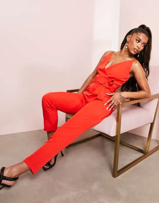 ASOS DESIGN - Combinaison cache-coeur à rayures avec pantalon carotte et ceinture à nouer - Rouge tomate | ASOS